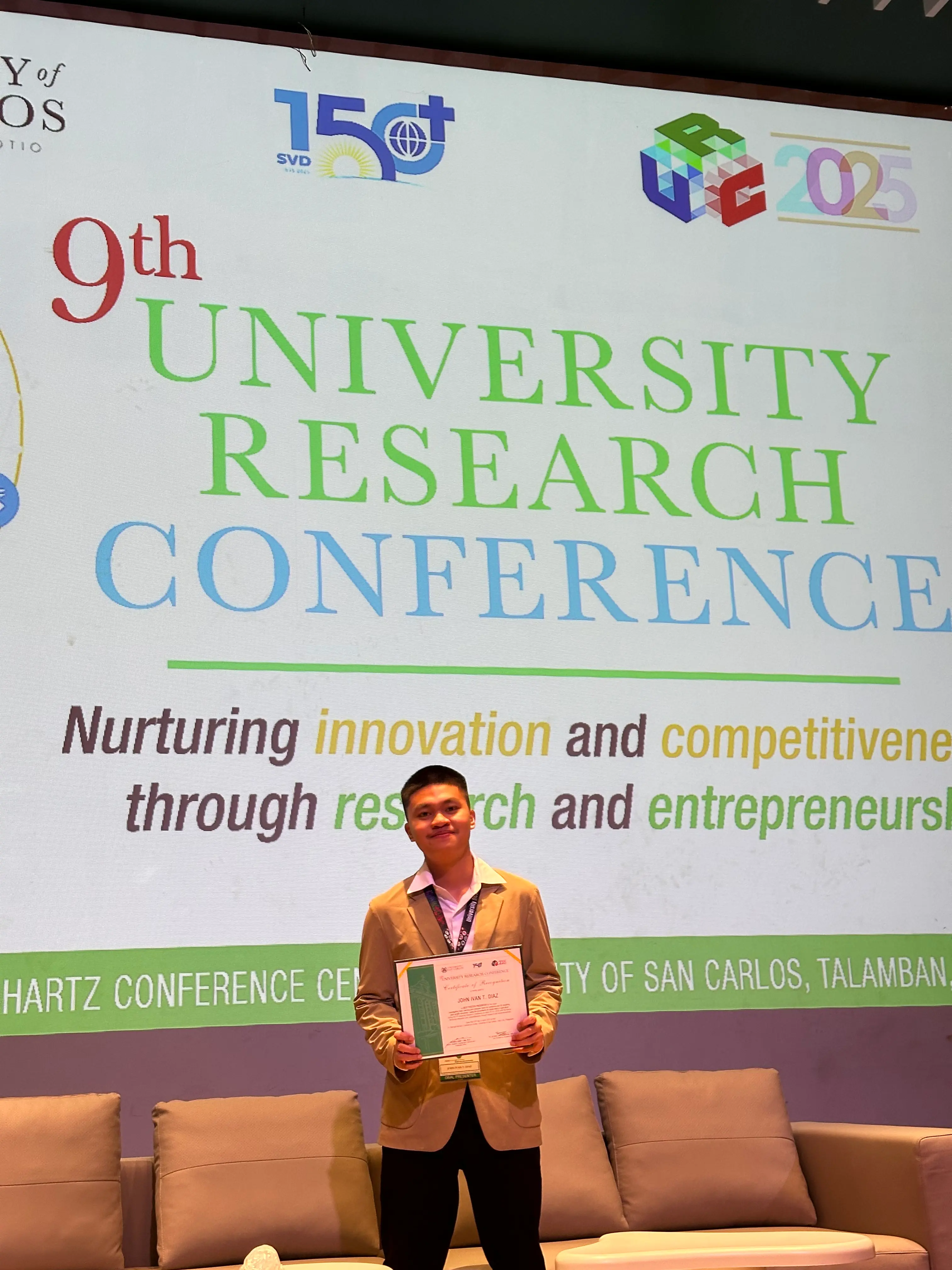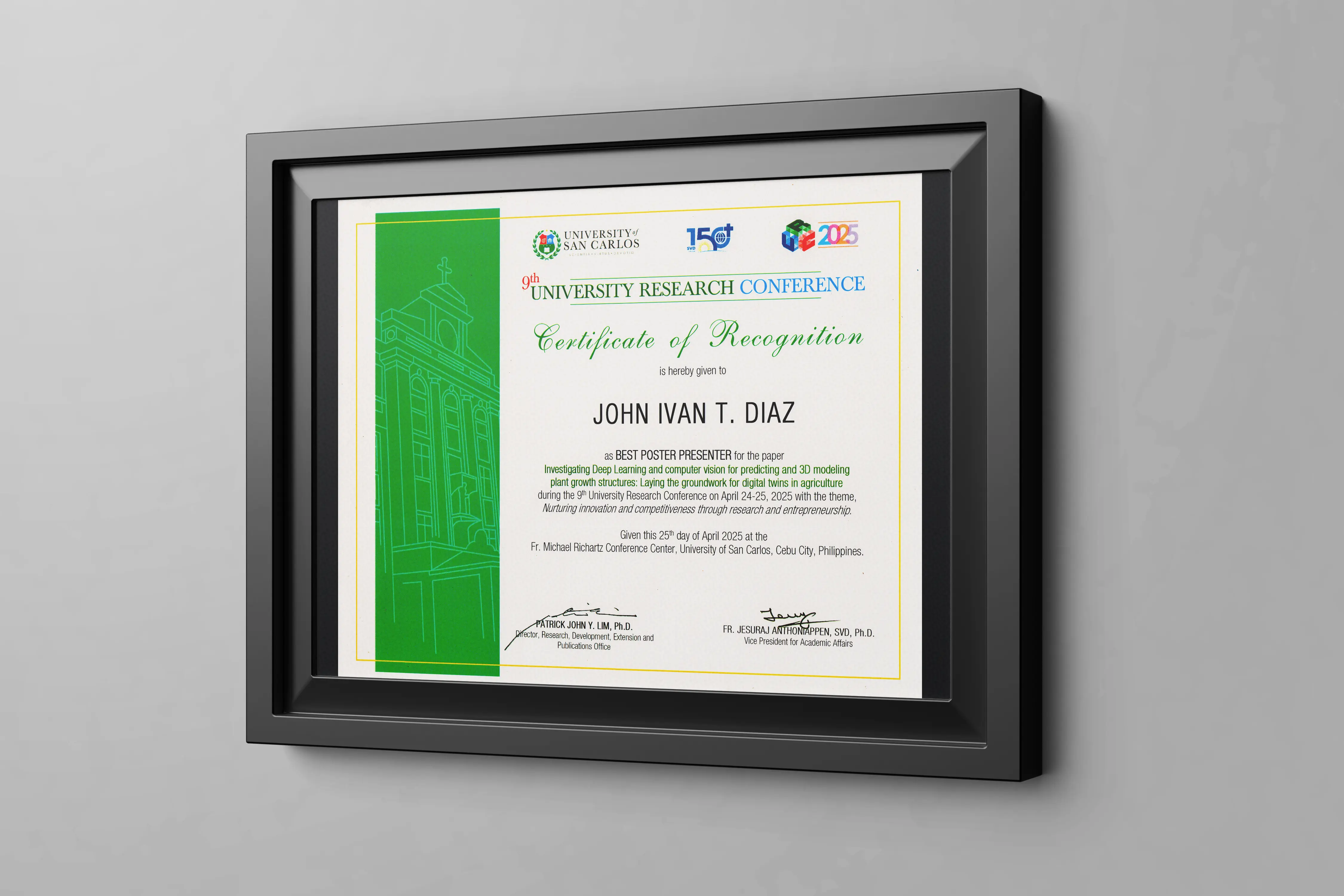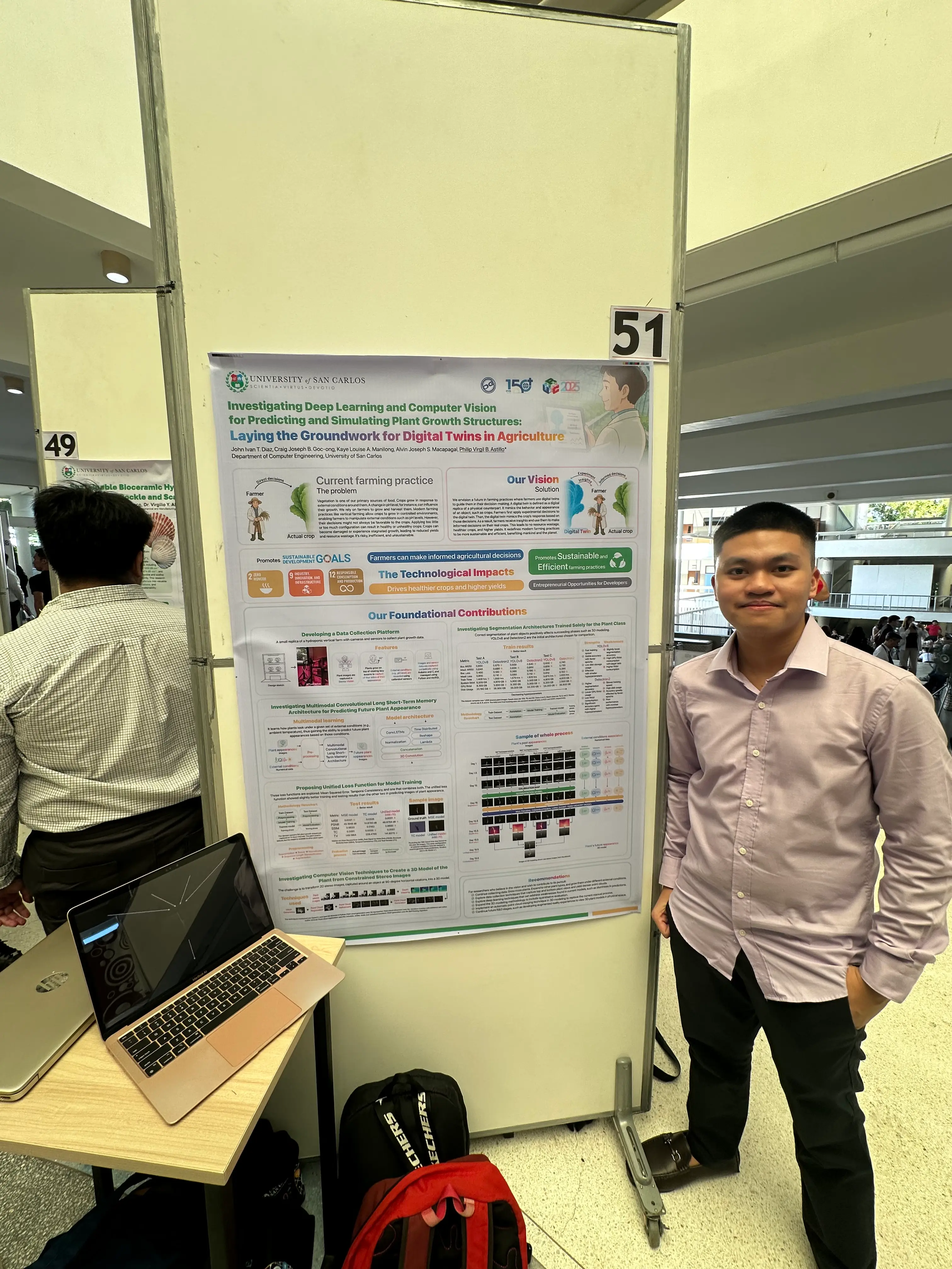 Presented my research titled “Investigating Deep Learning and Computer Vision for Predicting and Simulating Plant Growth Structures: Laying the Groundwork for Digital Twins in Agriculture,” as an oral and poster presenter at The 9th University Research Conference (URC 2025), held at the University of San Carlos Fr. Michael Richartz Conference Center, Cebu City, Philippines, in April 2025.