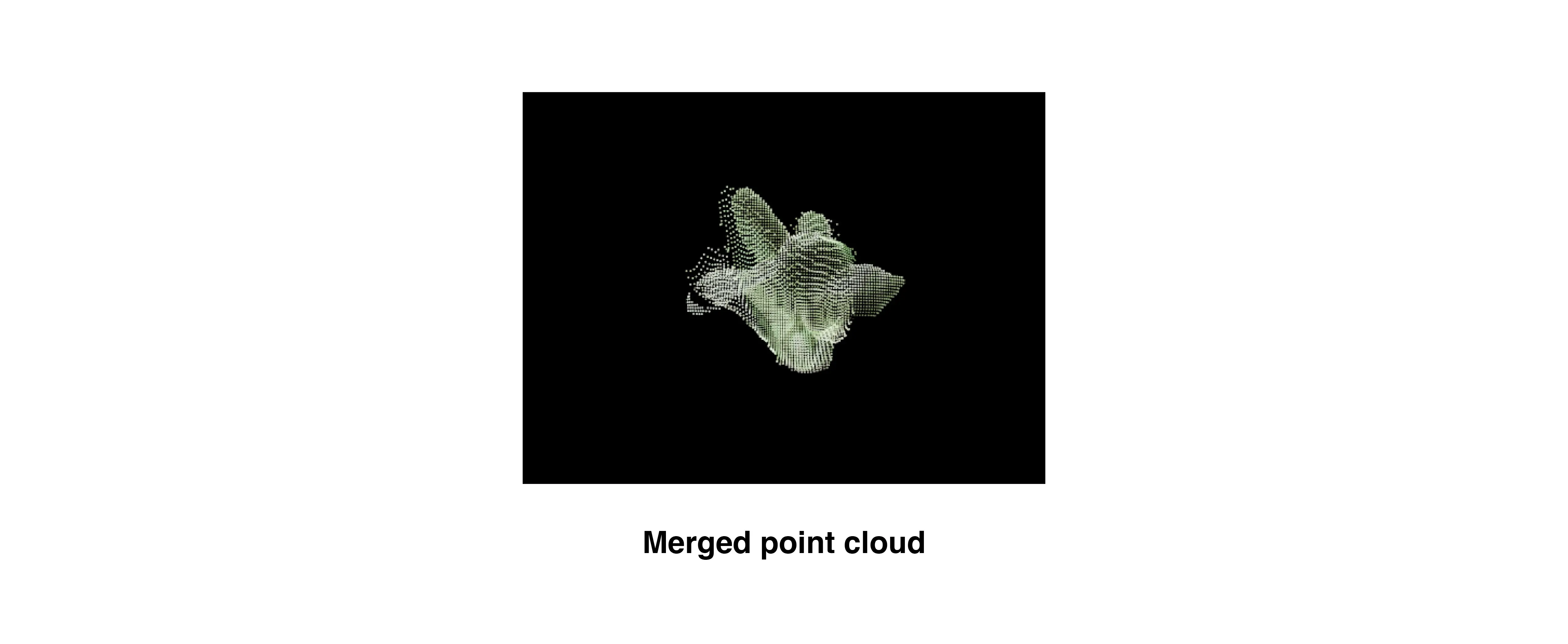 After individual refinement, the four point clouds are aligned into a common reference frame by applying the respective transforms $T_{\text{front}}$, $T_{\text{back}}$, $T_{\text{left}}$, and $T_{\text{right}}$. The merged point cloud is then expressed as the union: